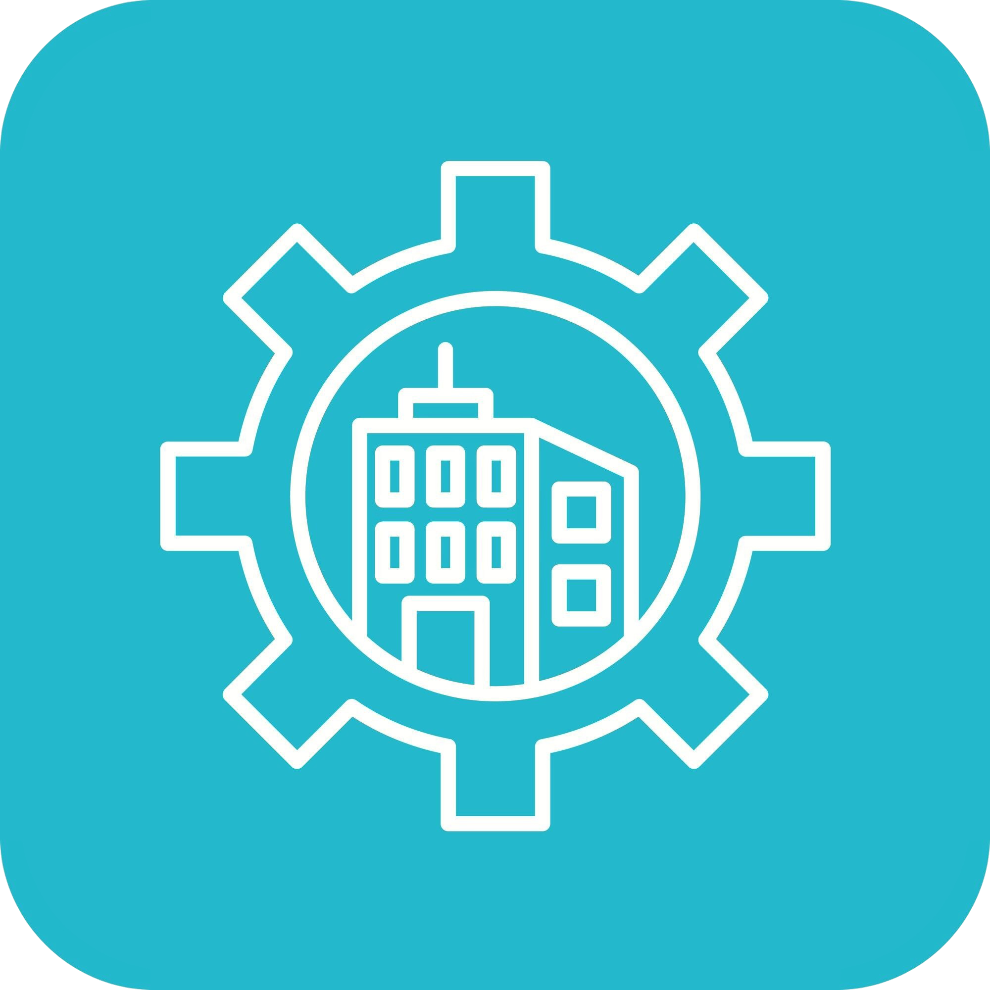 • A white outline of a building inside a gear icon on a teal background.
